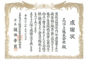 当社は、長年に渡り福岡県内に不法投棄された廃棄物の撤去活動に参加してまいりました。 生活環境の保全と公衆衛生の向上に寄与した功績は、顕著であり会員の模範となるものであるとして、公益社団法人福岡県産業廃 …